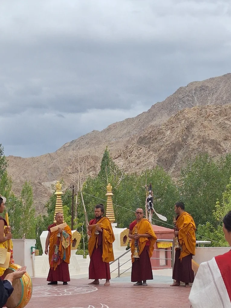 He was especially intrigued by a hill, revealing three different animal shapes. While meditating he had a vision of the protectress Achi on her blue horse. He interpreted this as an auspicious sign and decided to build the monastery on top of the hill. Later a rosebush sprouted and grew on the hill which can be seen inside the monastery to this day. The monastery has been served by a succession of Chojes appointed directly by the Drikung Kyabgons.