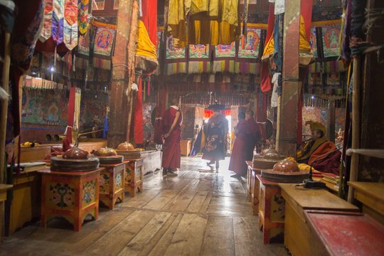 The assembly hall at Thiksey Monastery, known as the Dukhang or White Assembly Hall, is one of its most important structures. It houses murals of Shakyamuni Buddha, Maitreya, and other deities, and serves as the central space for prayers, rituals, and monastic gatherings.